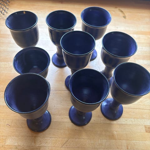 4 krus med fot (vinkrus), 2 store krus med hank (ølkrus), 1 vase, 2 høye lysestaker og stor skål/bolle.