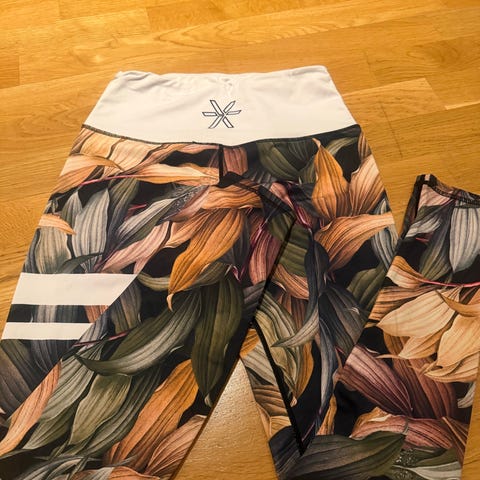 Bara Sportswear treningssett for dame i størrelse M i tights og S og XS' i topp. Sett består av to sports-bh-er og én lang treningstights. Farge mørk blå med lyse kontrastdetaljer på bh-ene og logo på både bh og tights. Tightsen har høyt liv og lomme på sidene av låret. Plaggene er laget i et elastisk, tettsittende materiale som egner seg til fitness og annen innendørs eller utendørs trening.
