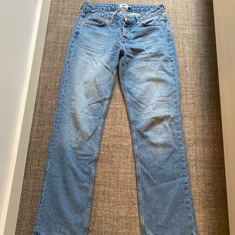 Toteme Straight jeans for dame i blå denim. Buksen er i størrelse 32 med livvidde W25. Materiale i bomull. Klassisk femlommersmodell med glidelås og knapp i front, beltehemper og rette ben. Passer til hverdagsbruk og kan kombineres med ulike topper og sko for et variert uttrykk.