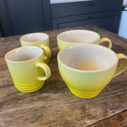Le Creuset kopper i keramikk. Bildene viser flere kopper i ulike størrelser og farger, blant annet lyserosa og mørk. Produktene har hank og er egnet til servering av varme drikker som kaffe, te eller kakao. Klassisk Le Creuset-design med logo preget i keramikkoverflaten. De er lite brukt
