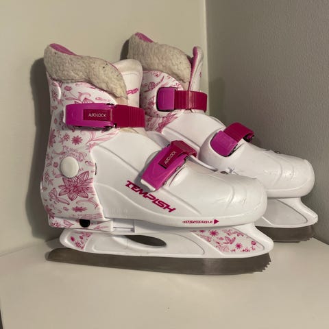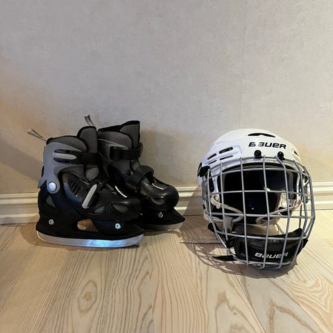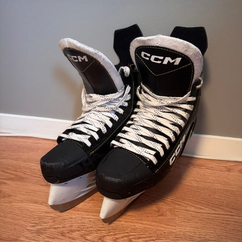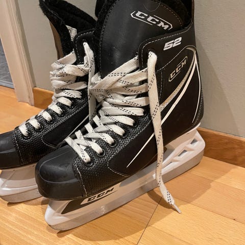 CCM 9044 ishockeyskøyter i størrelse 42. Skøytene er i hovedsak svarte med hvite detaljer og hvite lisser. Skøytene er merket med navn på innsiden av pløsen.
