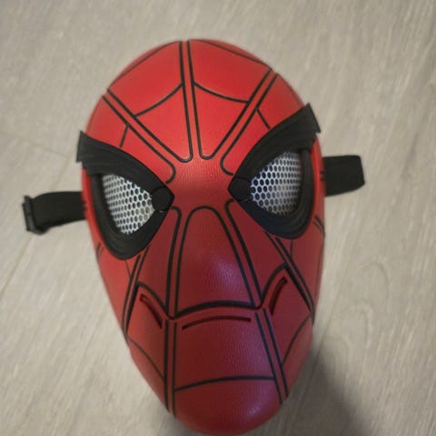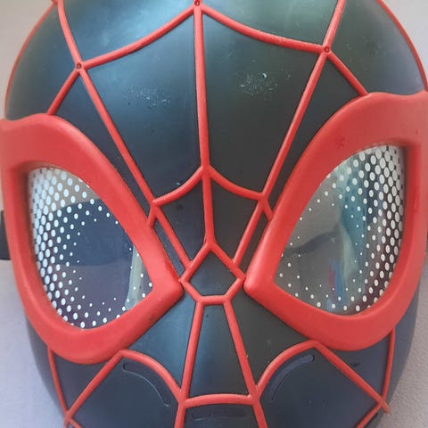 Spiderman maske for barn i svart med røde detaljer. Masken har netting foran øynene og justerbar stropp bak hodet for å holde den på plass. Egnet som utkledningsutstyr eller til rollelek for barn som liker Spiderman-universet.