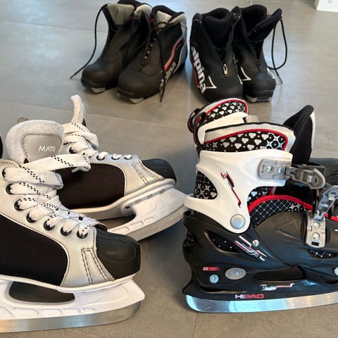 ishockeyskøyter for barn i svart og blå farge. Modellen har snøring, spenner og borrelås for stabilitet rundt ankelen. Sålen på innersålen på bildet viser omtrentlig lengde på foten som passer i skøyten.