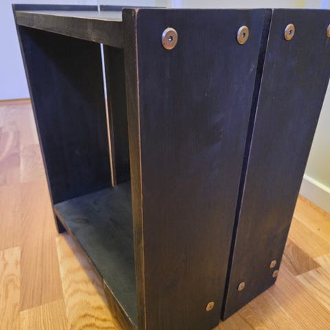 Selvbygget nattbord/skohylle i solid tre, ikke lakkert.