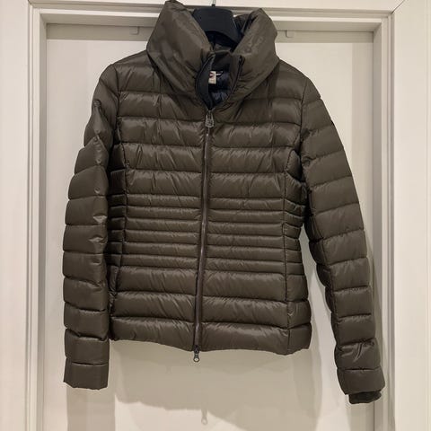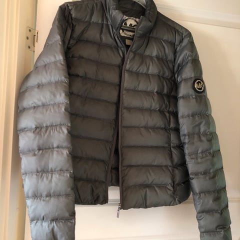 Michael Kors dunjakke for dame i størrelse L. Jakken er laget med dunfyll og har horisontale vatterte sømmer. Fargen er beige. Modellen har høy krage og glidelås i front med MK-detalj. Egnet som ytterjakke i kjøligere vær.