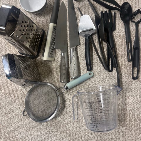 IKEA kjøkkenredskaper sett. Inneholder ulike redskaper til matlaging og baking, blant annet kjevle, visp, eggedeler, rivejern, korketrekker og mindre kjøkkenverktøy. Egnet til daglig bruk på kjøkkenet for tilberedning av mat og baking. 100kr