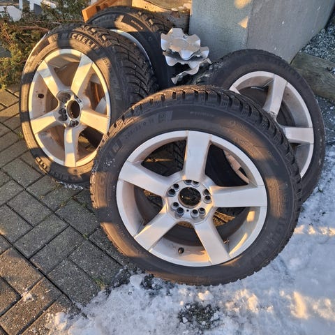 Dekk og felg til Mercedes E klasse . Sikkert passer til flere andra bil også . 2 dekk 245.45.18