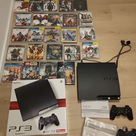 Selger ein komplett PlayStation 3 Slim-pakke med masse populære spill og utstyr. Perfekt for samler, retro-gamer eller deg som vil ha mykje gaming for pengane.