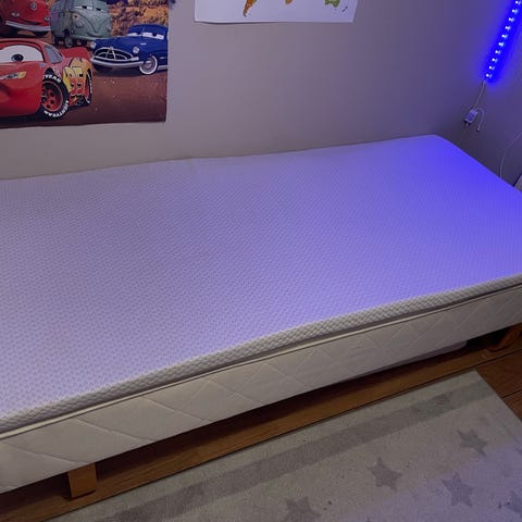 Jysk seng med overmadrass i grått tekstiltrekk. Sengen står på runde metallben og har en lys overmadrass på toppen. Tekstiltrekket på rammen er riflet/skadet på den ene langsiden, som vist på bildet. Egnet som enkeltseng eller gjesteseng i soverom. Størrelse er 90x200cm.