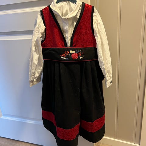 Name it bunadskjole for jente i størrelse 92. Kjolen er flerfarget med rød overdel, svart skjørt og hvit skjorte under. Plagget er laget i bomull. Tradisjonspreget design med broderte detaljer på overdelen og skjørtet, samt hvit skjorte med mønster og knapp på mansjettene.