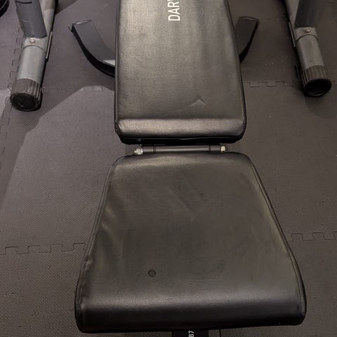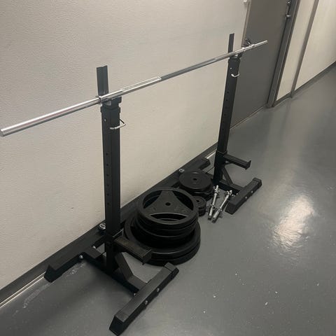 Godt brukt, men mye bruk igjen. Justerbart i 6-8 forskjellige høyder, funker til knebøy og benkpress.