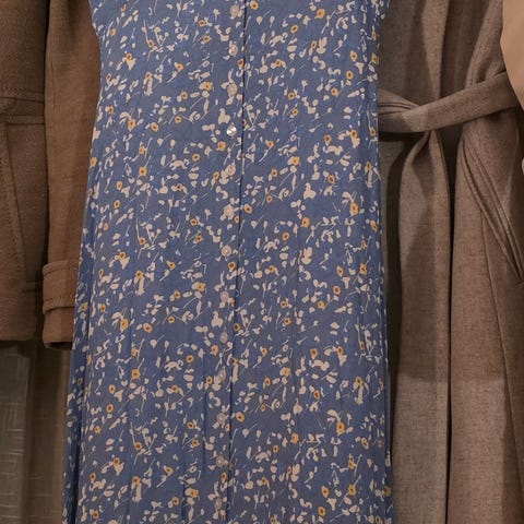 Kjolen er blå med lyst blomstermønster og er laget i viskose.