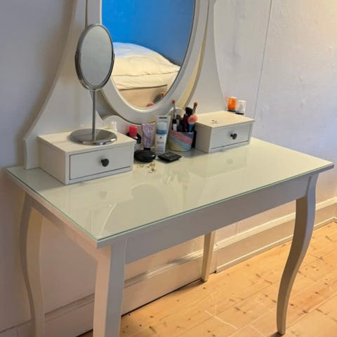IKEA sminkebord i hvit utførelse. Bordet har rektangulær bordplate og understell i metall med en enkel, rettlinjet ramme på hver side. Under bordplaten er det to uttrekkbare skuffer som gir oppbevaringsplass til mindre gjenstander. Egner seg som arbeidsbord, konsollbord eller sminkebord i for eksempel stue, soverom eller hjemmekontor.