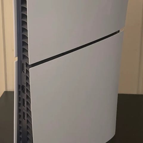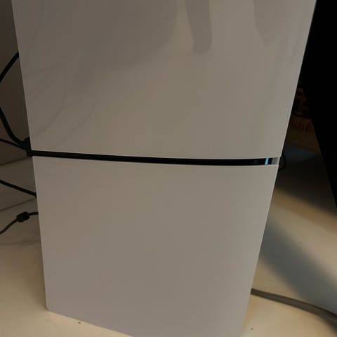 Sony Playstation 5 spillkonsoll i hvit farge. Konsollen har vertikal design med hvite sideplater og sort midtseksjon. Baksiden viser flere tilkoblingsporter for strøm, HDMI og USB. Egnet for bruk med kompatible PS5-spill, medier og tilkobling til TV eller skjerm via HDMI. Ingen ekstra tilbehør eller spesifikasjoner er synlige på bildene utover selve konsollen.