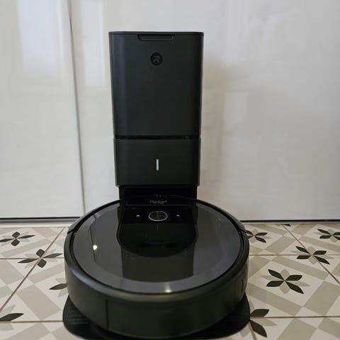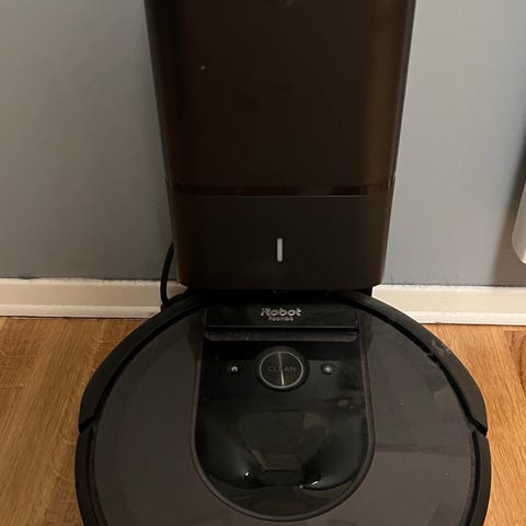 iRobot robotstøvsuger med tilhørende lade- og tømmestasjon.