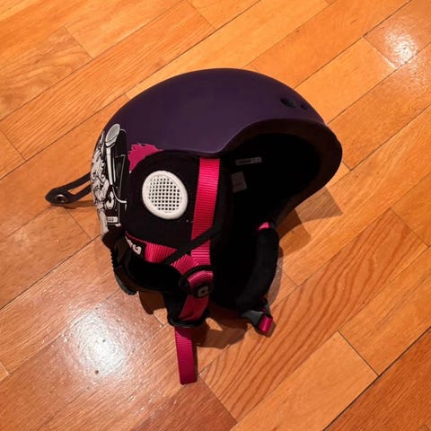 Frost Escape skihjelm i størrelse S, passer hodeomkrets 50–54 cm. Hjelmen har hardt ytterskall og ørebeskyttere med ventilasjon. Justeringshjul bak for tilpasning av passform. Design i lilla og rosa med grafiske motiver på sidene og baksiden. Egnet som skihjelm eller snowboardhjelm for barn eller ungdom innenfor oppgitt størrelsesområde.