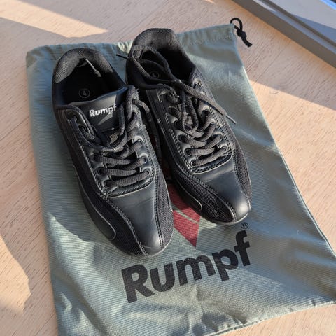 Rumpf dansesko i størrelse 37,5. Skoene er i svart skinn med snøring foran og hempe bak på hælen for enkel av- og påkledning. Yttersålen har felter med glatt og mønstret materiale som gir god bevegelighet, egnet for dans og innendørs bruk. Modellen er lav og lett, med polstret kant rundt ankelen for ekstra komfort.