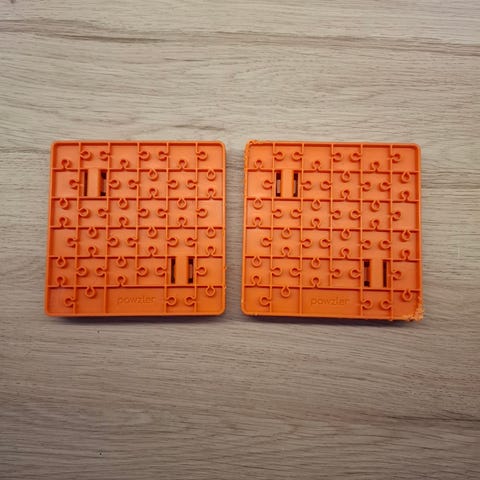 Selger en slowfeeder med 4 brikker som settes sammen. To gule i plast og to sorte i silikon som har sugekopper under. De i silikon er ikke helt rette, men fungerer.