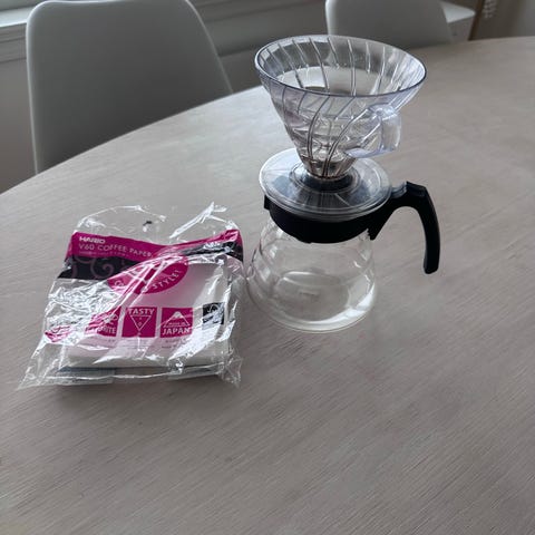 Setter inneholder papirfilterfilter, en kalita serveringskanne i glass til å brygge kaffen i, en kaffebrygger fra bialetti. Pent brukt.