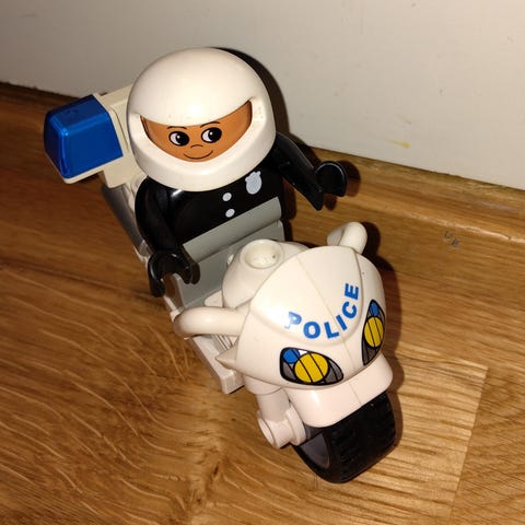 📍Inkluderer politimannfigur, politimotorsykkel, trafikklys, trafikkjegle, Lego Duplo kliss og politistasjon (fra et annet sett).