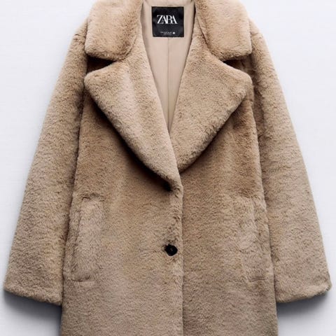 Zara kåpe i fuskepels for dame i størrelse S. Kåpen er lyse grå og har myk, pelslignende overflate. Modellen har krage, knapper i front og påsydde lommer. Egnet som yttertøy i kjøligere vær.