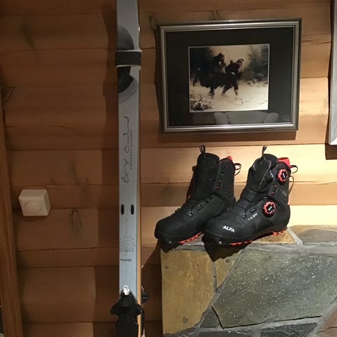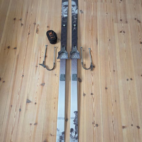 Selger et par pent brukte Aasnæss Helge Ingstad fjellski med rottefella Bc bindinger og Åsnes mohair kortfell. Skiene er pent brukt med lite riper.