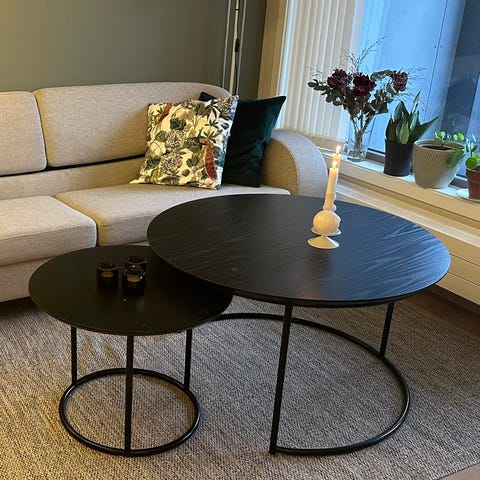 To runde svarte sofabord. Litt slitt på platen som vist på bildet.