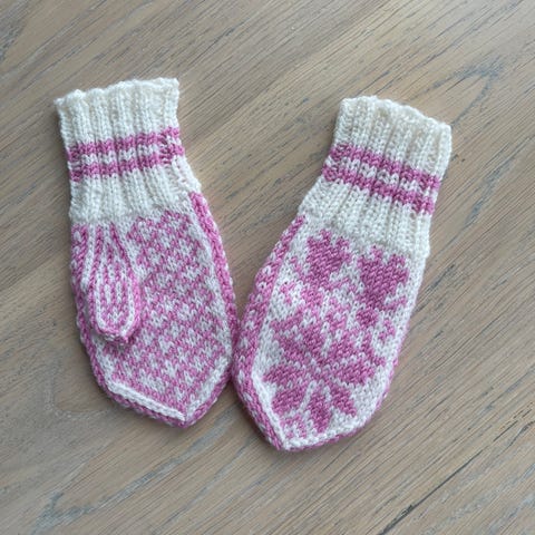 Strikkede votter til jente i størrelse 4-10 år. Vottene er strikket i ull og har et mønster i rosa og hvitt. De har ribbestrikket vrangbord ved håndleddet for bedre passform. Egner seg til bruk på kalde dager for å holde hendene varme.