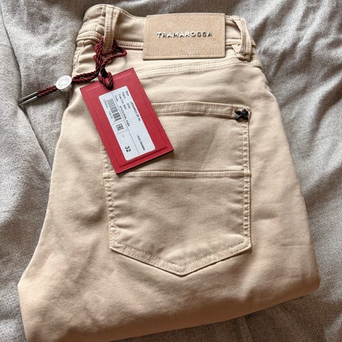 Selges pga brukes ikke, kun blitt brukt 1 gang. Helt nydelige bukser og veldig fine nå til sommeren. Strls 32 men har blitt skreddet så tilsvarer en 32/31 ish. Kan evt skreddes opp til vanlig strls som vil være 32/34. 😁