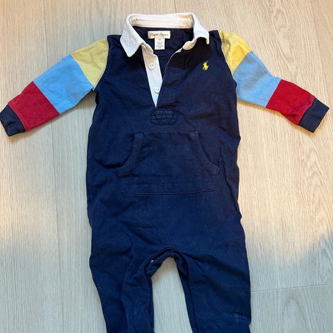 Ralph Lauren heldress for barn i størrelse 6 mnd. Heldressen er i blå fløyel og er laget for unisex bruk. Modellen har lange ermer og lange ben, samt hette. Lukkes med trykknapper foran. Mykt materiale som egner seg godt som ytterplagg eller kosedress for små barn. Vattert.