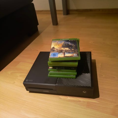 Xbox one med 3 spill og 2 kontroller. Er også en eldre utgave av fifa på den 15 eller 16.