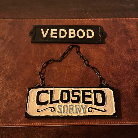 Vegghengt treskilt med metallmotiv og tekst