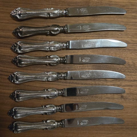 Knivene er brukt tidligere, og kan tenkes å ha enkelte bruksmerker. Disse knivene virker til å være i god stand. Disse knivene er ikke pusset av meg. Knivene blir blankere om de pusses.