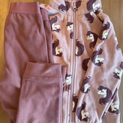 Name it joggedress for jente i størrelse 98. Sett med genser med enhjørningmotiv på brystet, samt matchende bukse