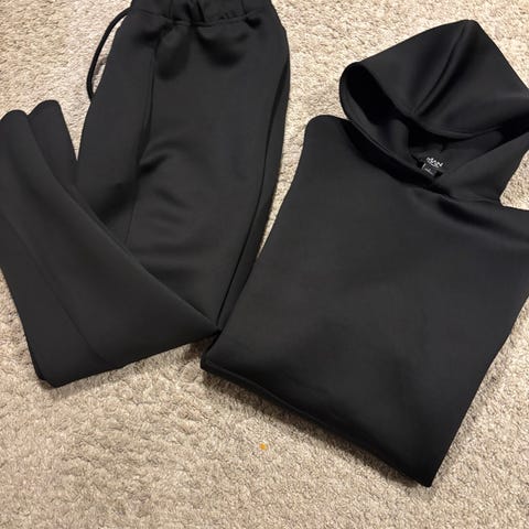 Joggedress for herre i størrelse M, bestående av hettegenser og joggebukse i brun farge. Hettegenseren har kengurulomme foran, snøring i hetten Joggebuksen har strikk og snøring i livet, ribbekant nederst ved bena, sidelommer samt en ekstra lomme på låret. Passer til hverdagsbruk og ulike typer fritidsaktiviteter. Varm og god