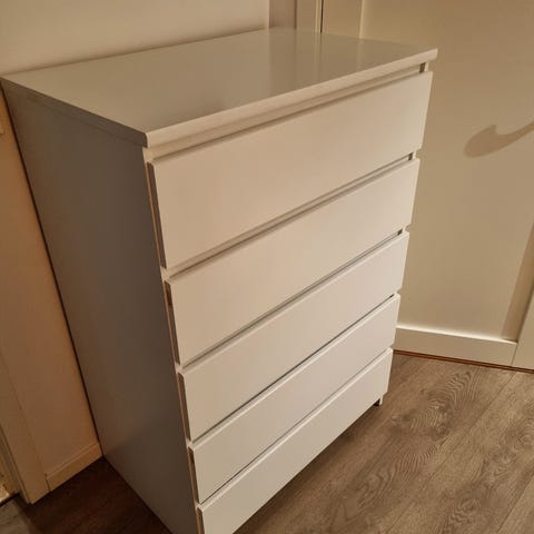 Selger denne kommoden fra IKEA på grunn av flytting, ble kjøpt ny i september 2025. Den ene platen til skuffen er løs, men det skal nok være mulig å fikse.