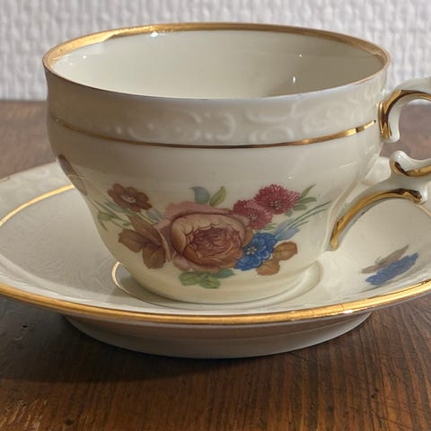Koppen står på elegant stett og har fine gullstafferinger langs kant og fot, noe som gir et klassisk og tidløst uttrykk. Den passer like godt til kaffe eller te som i vitrineskap eller som dekor i et retro- eller nordisk interiør.
