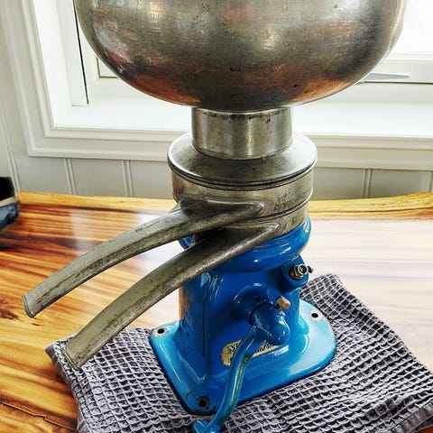 Domo melkeseparator i metall. Enheten består av en rød base med sveiv og en stor metallbeholder på toppen for melk. Separatoren er manuelt drevet med håndsveiv og har tut for uttak av separert melk og fløte. Egnet for bruk i forbindelse med tradisjonell melkeprosessering på gård eller i hjemmemiljø hvor man ønsker å skille melk og fløte mekanisk. Virket når jeg arvet den for 5 år siden. Etter det bare stått lagret tørt, mørkt og ca +10 grader