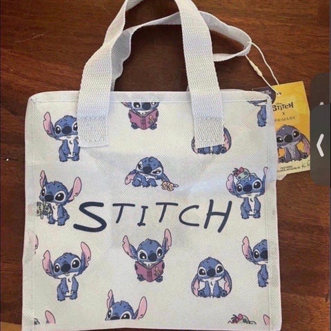 Disney Stitch handlenett i hvit farge med trykk av Stitch-figurer. Vesken har to korte bærehåndtak og er egnet til lett bæring av mindre gjenstander, som bøker, leker eller småting til hverdagsbruk. Laget i tekstilmateriale med trykket motiv på begge sider.