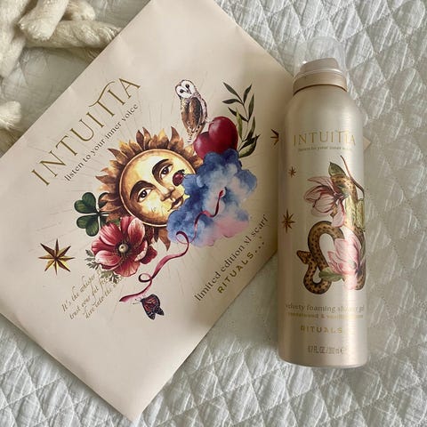 Rituals Intuïtia gavesett med kroppspleieprodukter og duftlys. Settets innhold inkluderer blant annet skumdusj, kroppsskrubb, håndsåpe og duftlys i samme serie. Produktene leveres samlet i original eske med tilpasset innmat som holder produktene på plass. Egnet som komplett sett til badet eller som gave.
