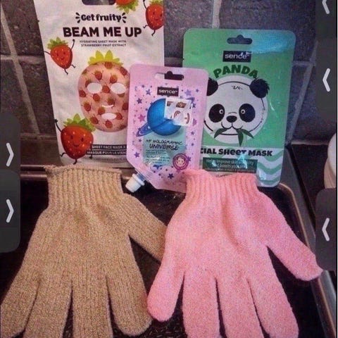Sence Exfoliating Foot Mask i størrelse 40-46, med lavendelduft, designet for å fjerne døde hudceller og gjøre føttene mykere. 7th Heaven Charcoal Mud ansiktsmaske med aktivt kull, ment for rensing og detox av huden.