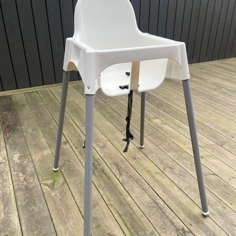 IKEA høy barnestol med avtagbart brett. Stolen har fire rette ben og sete med pute og sikkerhetssele. Egnet for små barn som kan sitte selv ved spisebordet. Plastoverflater og metallben som er enkle å tørke av og holde rene. Passer til bruk på kjøkken eller spisestue.