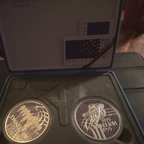 Flott skrin med sertifikater, til gull og sølvmyntene utgitt i forbindelse med Sykkel VM 1993 Hamar - Oslo.