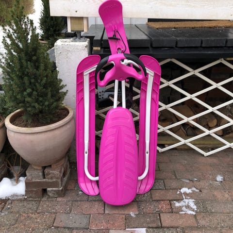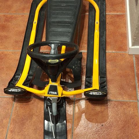 Stiga rattkjelke i svart og gul farge. Kjelken har rattstyring med forski som kan svinges. Med bremse