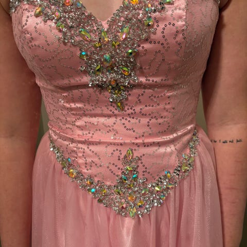 Brukt en gang på skoleball. Ser ubrukt ut. Kjolen er lys rosa med perlebesatt overdel, både foran og på ryggen. Glitter i tyllen i skjørtet.