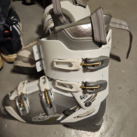 Salomon alpinstøvler i størrelse 25. Støvlene er i grå farge med blå spenner og flere justerbare spenner over vrist og skaft for tilpasning. Passer til bruk i alpinbakke med standard alpinbindinger. Egnet for personer som bruker mondopoint størrelse 25 i alpinstøvler.