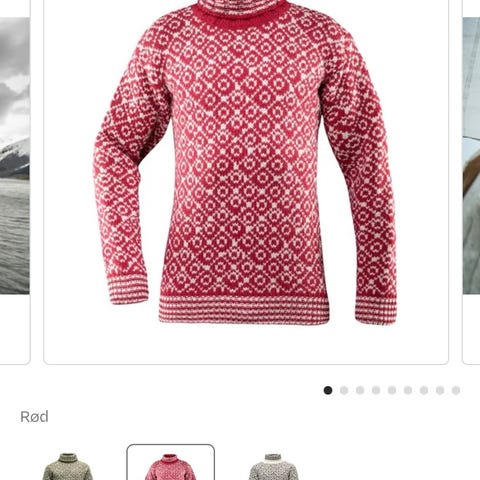 Ribbestrikkede kanter i hals, ermer og nederkant. Litt splitt nederst i sidene. Deilig og varm ull, vid passform .