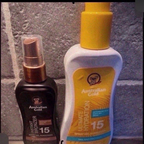 Australian Gold Instant Bronzer Spray Gel Sunscreen med SPF 15 og SPF 30. Solbeskyttelse i spraygel-form med bronzer-effekt. Vannresistent og egnet for bruk ved soling for å beskytte huden mot UV-stråler.
