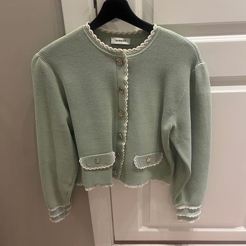 Populær Sandro Paris cardigan i kremhvit. Genseren er i alpakkamiks: 28% alpakka, 25% ull, 6% viskose, 4% elastan, 34% polyamid, 3% polyester.