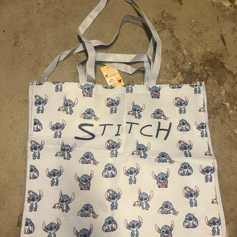 Disney Stitch stoffveske i tekstil. Vesken har motiv av figuren Stitch på begge sider og korte bærehåndtak. Unisex-modell som kan brukes til hverdags, handling eller oppbevaring av småting.